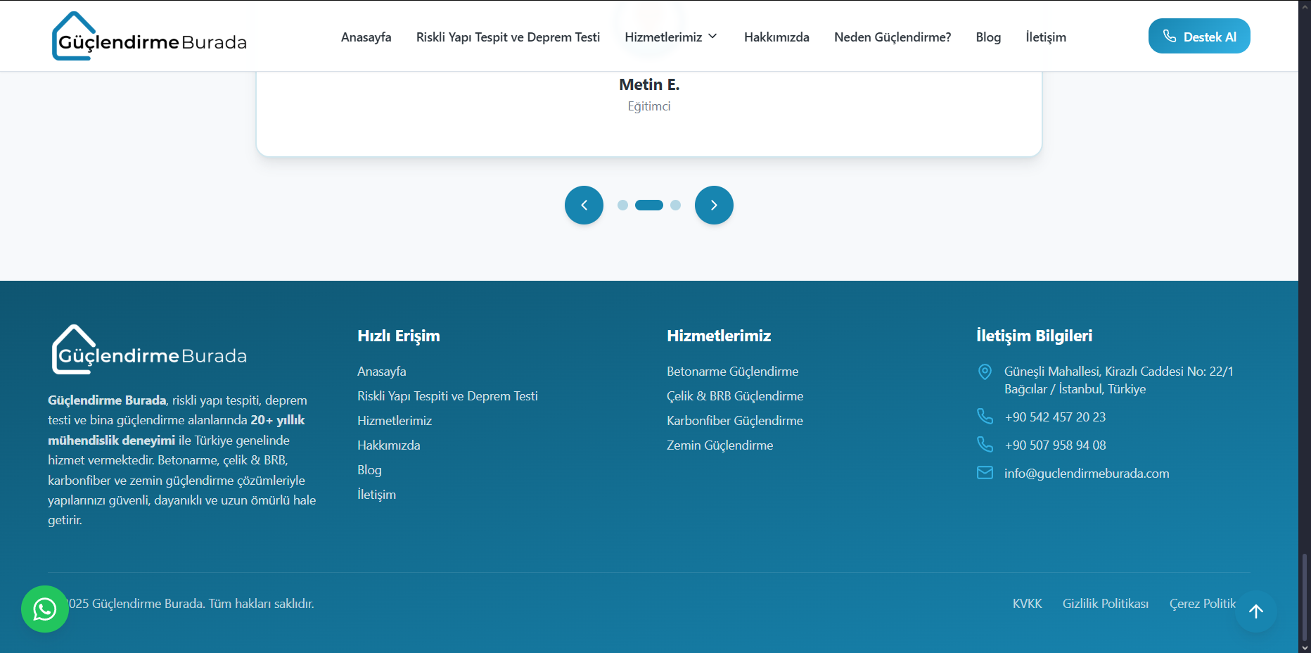 Güçlendirme Burada is a professional engineering platform dedicated to improving the earthquake safety of buildings across Türkiye. It provides comprehensive structural services, including earthquake resistance testing, risky building assessment, core sampling, concrete reinforcement projects, CFRP (carbon fiber) strengthening applications, steel reinforcement solutions, and soil improvement services. With a modern and user-friendly interface, the platform helps property owners and businesses easily access technical information, review strengthening methods, and connect with certified engineers. Built on accuracy, reliability, and transparency, Güçlendirme Burada aims to ensure that every structure becomes safer, stronger, and more resilient against earthquakes.